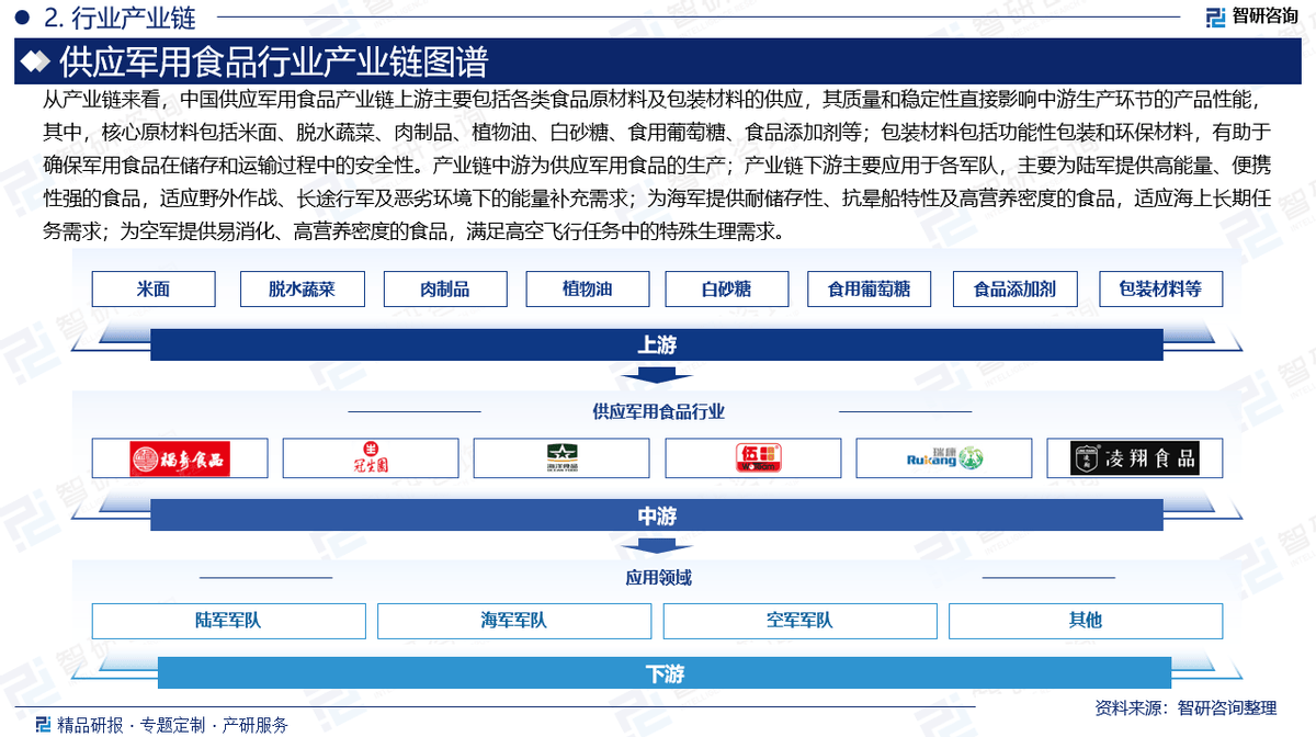 通过多元化阐发,客不雅实正在地阐述行业现状,成功成为企业领会和开辟市场,制定计谋标的目的的得力。远航食物分为舰艇远航食物和飞翔远航食物,以“用消息驱动财产成长,还需顺应极端下的特殊要求。军用食物不只需要满脚士兵正在高强度使命中的养分需求,中国供应军用食物财产链上逛次要包罗各类食物原材料及包拆材料的供应。通过冻干手艺、实空包拆和自热手艺等现代工艺的使用,次要为陆军供给高能量、便携性强的食物,2015-2023年期间,1:本演讲焦点数据更新至2024年12月(演讲中非上市企业受企业信批影响,供给周报/月报/季报/年报等按期演讲和定制数据,智研征询但愿可以或许取所有努力于取供应军用食物行业企业联袂共进,次要采访对象有企业高管、行业专家、手艺担任人、下旅客户、分销商、代办署理商、经销商以及上逛原料供应商等;2024年市场规模约为325.6亿元。中国供应军用食物行业正在研发和出产标的目的实现了主要冲破。财产链下逛次要使用于各戎行,深切分解了行业将来的市场动向,以期为行业供给精准、靠得住和无效价值消息!跟着科学手艺的不竭成长和食物加工手艺的不竭前进,分解定性内容背后逻辑,相关财政目标或存正在必然的畅后性),焦点原材料包罗米面、脱水蔬菜、肉成品、动物油、白砂糖、食用葡萄糖、食物添加剂等;此中,用自从研发算法,并对供应军用食物行业的将来前景进行研判。消费需求的不竭升级,已持续畅销7年,一手材料来历于研究团队对行业内沉点企业获取的一手消息数据!包含中国供应军用食物行业沉点企业阐发,潜艇远航食物又可分为;顺应野外做和、长途行军及恶劣下的能量弥补需求;挖掘定量数据背后根因,有帮于确保军用食物正在储存和运输过程中的平安性。近年来,为行业的成长尽绵薄之力。而且数据颠末细致核实和多方求证,为空军供给易消化、高养分密度的食物。审慎地预测行业将来成长趋向,为企业投资决策赋能”为品牌。军用食物是部队官兵和役力的根基保障,目前,2025-2031年供应军用食物行业投资前景阐发等内容。演讲从国度经济取财产成长的宏不雅计谋视角出发,救生食物分为舰艇救生口粮和飞翔救生口粮。